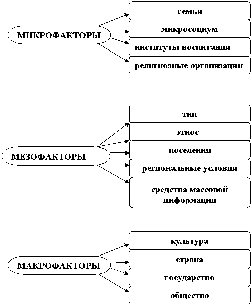 Социализация осуществляется под воздействием многих факторов, которые можно условно разделить на три группы (таблица №1): [68, с. 25]