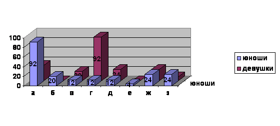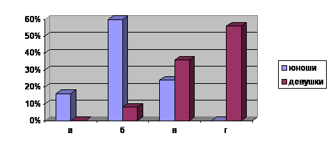 По результатам ответов построена диаграмма (см. диаграмма 5). Из которой видно , что юноши предпочитают более крепкие напитки слабым, а девушки наоборот.