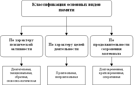 Существует несколько основных подходов в классификации памяти. В настоящее время в качестве наиболее общего основания для выделения различных видов памяти принято рассматривать зависимость характеристик памяти от особенностей деятельности по запоминанию и воспроизведению.