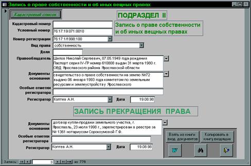Эта регистрационная база позволяет точно систематизировать и классифицировать поступающую информацию по содержанию и значению. Кроме того, есть возможность произвести быстрый поиск землепользователя или информации того или иного содержания и значения. Регистрационная база представляет собой список рабочих окон, различных по содержанию и значению.