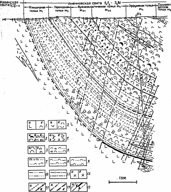 1 — базальты плагиофировые, пироксен-плагиофировые (а), андезитобазальты (о); 2 — андезиты (а), дациты, риодациты (б); 3 — туфы глыбовые (а), агломератовые (б), крупнопсефитовые (в), мелкопсефитовые (г), кристаллолитотуфы (е), 4— туффиты агломератовые (а), крупнопсефитовые (б), мелкопсефитовые (в), псаммитовые (г); 5— тефроиды мелкопсефитовые (а), псаммитовые (б); 6— туфоконгло-мераты, туфопесчаники; 7 — туфогравелиты, туфопесчаники; 8 — туфопесчаники, туфоалевропесчаники; 9 — туфопесчаники, туфоалевролиты; 10— песчаники, алевропесчаники, алевролиты; 11— кремнистые, углисто-кремнистые алевролиты, алевропелиты; 12 — диориты (а), кварцевые диориты (б); 13 — внемасштабный знак даек основного (а) и среднего (б) составов; 14 — тектонические нарушения: сбросы, взбросы (в), малоамплитудные надвиги (б); 15— границы геологических тел (а), толщ и подтолщ (б), пачек (в)