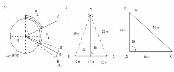 При построении на местности проектного угла должна быть закреплена вершина О и начальное направление ОА (см. рис. 1 а). Требуемый штрих закрепить на местности точку В, чтобы угол АОВ имел проектное значение b.