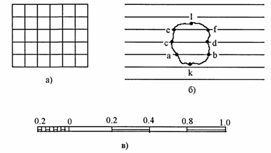Чтобы не выполнять вычислений строят специальную шкалу — масштабную палетку (рисунок 4в), по которой определяют площадь участка, зная сумму средних линий. Рассчитаем основание шкалы для масштаба 1:10000. При расстоянии между параллельными линиями 2 мм и при длине шкалы 1 см площадь будет равна 20 ´ 100 = 2000 м 2 = 0,20 га. Следовательно, каждому сантиметру шкалы будет соответствовать 0,20 га на местности. Левое основание шкалы делят на 10 частей. После того как сумма средних линий набрана в раствор циркуля, определяют площадь по шкале так же, как расстояние по линейному масштабу.