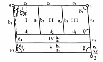 Поля овощного севооборота запроектировать в форме трапеций в такой последовательности: V, VI, III, II, I. Границы полей V и VI должны быть параллельны линии 10-М, а границы полей II и III — линии l-2. Так как проектирование ведётся по площади чистой пашни, перед проектированием вычисляют исходное основание трапеции V поля