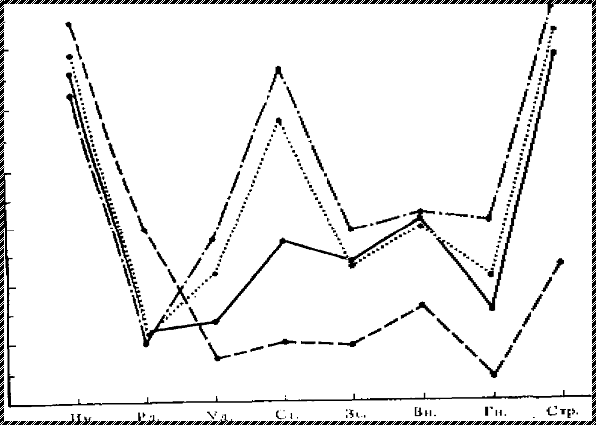 Данный рисунок отображает профили средних показателей по ШДЭ для высоко и низко встревоженных испытуемых в реальных и воображаемых условиях вызывающих тревожность.
