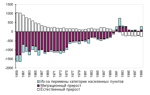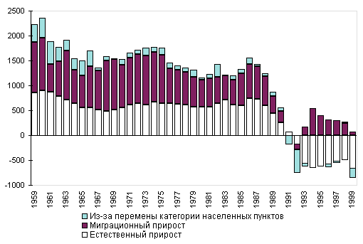 Рис. 1. Компоненты прироста (убыли) городского населения России, 1959-1999, тыс. человек