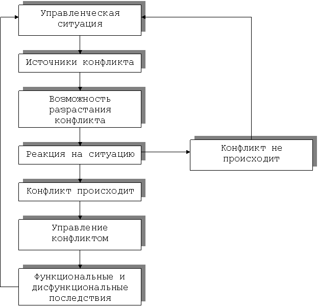 На этой схеме видно, что существование одного или более источников конфликта увеличивает возможность возникновения конфликтной ситуации в процессе управления.