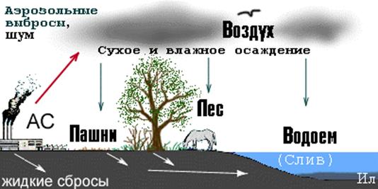 Выбросы могут быть как постоянными, находящимися под контролем эксплуатационного персонала, так и аварийными, залповыми. Включаясь в многообразные движения атмосферы, поверхностных и подземных потоков, радиоактивные и токсические вещества распространяются в окружающей среде, попадают в растения, в организмы животных и человека. На рисунке показаны воздушные, поверхностные и подземные пути миграции вредных веществ в окружающей среде. Вторичные, менее значимые для нас пути, такие как ветровой перенос пыли и испарений, как и конечные потребители вредных веществ на рисунке не показаны.