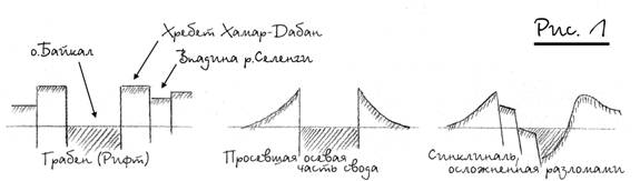 По-видимому, главную роль в возникновении впадин байкальского типа играют изгибовые деформации земной коры, сопровождающиеся разломами, причем перемещение блоков по разломам приобретает основное рельефообразующее значение. Наличие ступенчатых террас по бортам ванны Байкала отчасти подтверждает это (хотя необходима оговорка– число и происхождение террас дискуссионно).