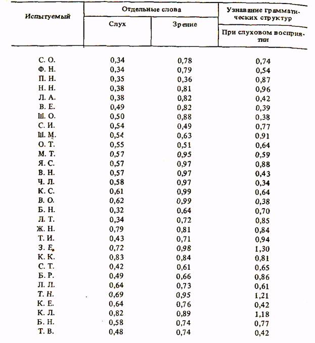 Невозможность в этих условиях последовательной деятельности по представлению различных вариантов и выбору из них наилучшего следует из сопоставления времени адекватных реакций на одиночные слова и речевые структуры со временем простой двигательной реакции на звуковой сигнал (0,14 с). Полученные в эксперименте длительности лишь в 3—6 раз превышают время простейшего психологического явления, в то время как количество хранимых в памяти реакций (адекватных русских ел ч) и число возможных сигналов (случайно подаваемых