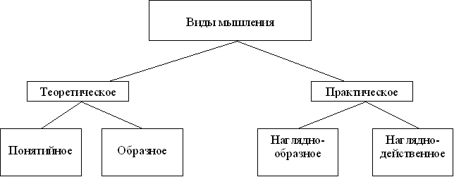 Мышление – это особого рода умственная и практическая деятельность, предполагающая систему включенных в нее действий и операций преобразовательного и познавательного характера. В психологии выделяют и исследуют теоретическую, практическую и ряд промежуточных видов деятельности, содержащих в себе и те и другие операции. На рисунке представлены основные виды мышления.