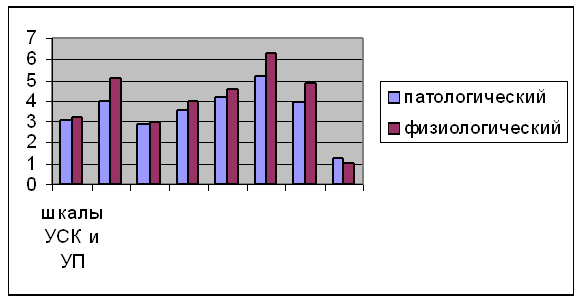 Сравнительный анализ показателей по Т-критерию Стьюдента показал (рис.1), что женщины с патологическим протеканием климакса достаточно выражено отличаются по показателям всех методик от женщин с физиологическим климаксом.