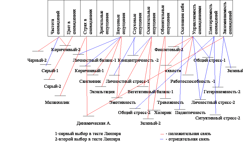 Так, частота сновидений отрицательно связана с выбором коричневого цвета и положительно – с выбором серого цвета. Видимо, сновидения у этих лиц носят компенсаторный характер и связаны с желанием защитить себя от внешних воздействий. В то же время коричневый цвет располагается тем ближе к концу ряда, чем больше сновидений, т.е., по-видимому, частота сновидений выше у лиц, близких к выздоровлению, т.к. их потребность в физическом покое расценивается как слабость, которую нужно преодолеть, что опять указывает на компенсаторную функцию частоты сновидений.