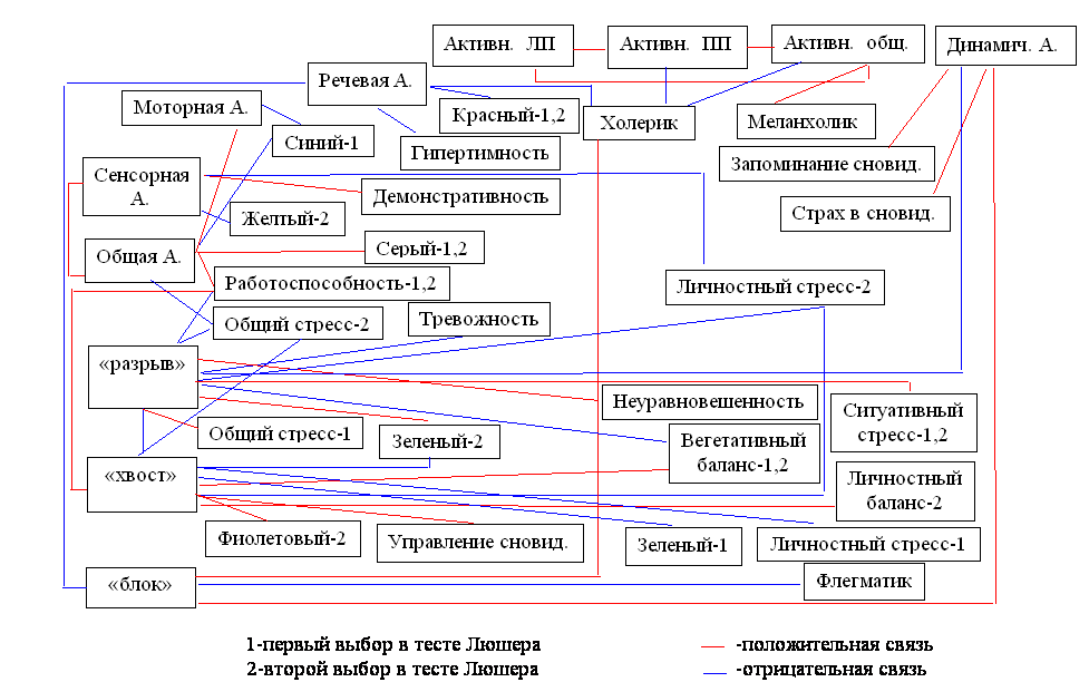 В исследованной группе выявлено 25 корреляций психофизиологического статуса и сновидений (17 отрицательных и 8 положительных связей) (см. рис. 4), а также 30 связей с блоком асимметрии (17 положительных и 13 отрицательных) (см. рис. 5).