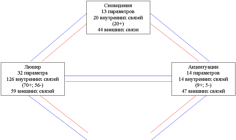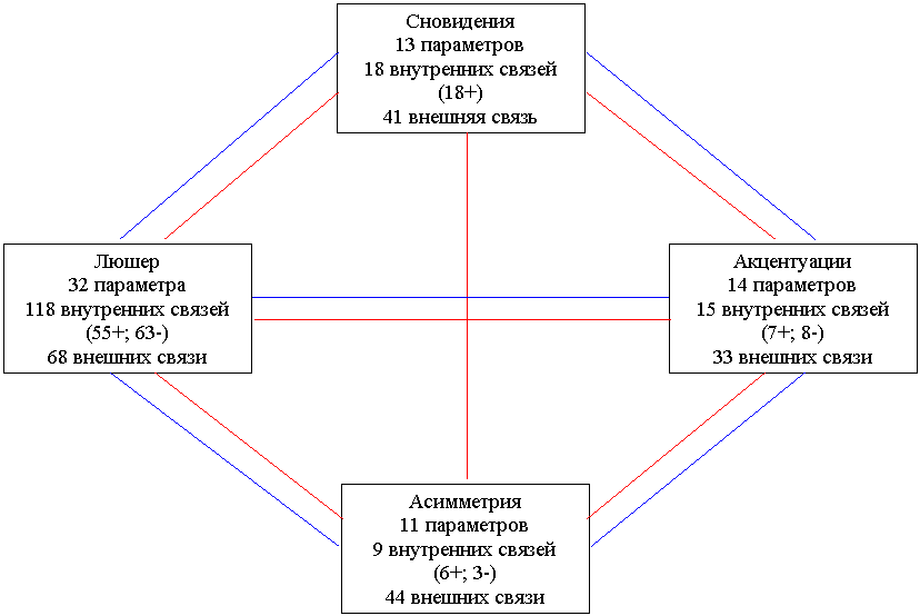При патологии большое количество корреляций различных параметров с нарушениями нормальной обработки информации в коре мозга, отражающимися в разрывах, хвостах и блоках, может свидетельствовать в пользу предположения о значительном нарушении процессов саморегуляции и взаимодействия с внешним миром (см. рис. 5). В частности, это подтверждается большим числом связей с параметрами второго выбора в тесте Люшера. Функциональное состояние и связи правого полушария головного мозга меняются в процессе беременности, и сновидческая деятельность может отражать и провоцировать эти изменения (см. рис. 8).