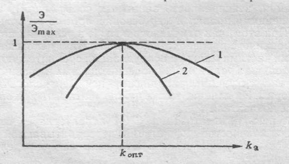 Для каждой СЧМ существует некоторая оптимальная степень автоматизации (koпт), при которой эффективность СЧМ становится максимальной. При этом чем сложнее СЧМ, тем больше потери эффективности из-за неправильного выбора степени автоматизации. Это видно из сравнения кривых 1 и 2 на рис. Оптимальная степень автоматизации устанавливается в процессе решения задачи распределения функций между человеком и машиной.