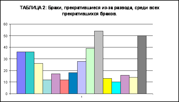 В нашей стране наряду со свободой брака существует и право супругов на развод. По статистике на 1990 год ещё в бывшем СССР ежегодно расторгалось примерно 930 тысяч браков (это приблизительно 1,5 % от их общего количества) и образовывалось 2788 тысяч новых семей. Таким образом, соотношение между браками и разводами составляет примерно 3:1. Но этот показатель различен в зависимости от места жительства и возраста людей. Так в больших городах разводов приходится больше чем в сельской местности. Так если посмотреть таблицу 2, мы видим, что наименьшее количество разводов приходится на регионы, где ещё сильны патриархально-религиозные традиции. Это среднеазиатские и кавказские республики.