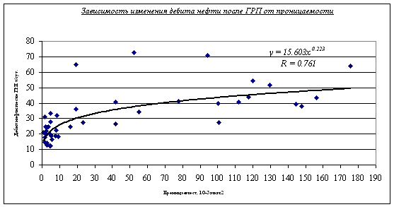 Рис.1. Зависимость изменения дебита нефти после ГРП от проницаемости.