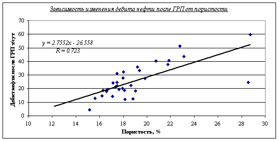 Рис.2. Зависимость изменения дебита нефти после ГРП от пористости.