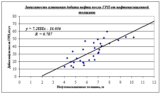 При средней нефтенасыщенной, толщине равной 6 м., дебит нефти после ГРП, определяется по зависимости [3] и составляет 29,2 т./сут.