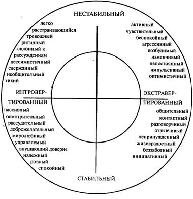 1. Экстраверсия — интроверсия. Характеризуя типичного экстраверта, автор отмечает его общительность и обращенность индивида вовне, широкий круг знакомств, необходимость в контактах. Он действует под влиянием момента, импульсивен, вспыльчив, беззаботен, оптимистичен, добродушен, весел. Предпочитает движение и действие, имеет тенденцию к агрессивности. Чувства и эмоции не имеют строгого контроля, склонен к рискованным поступкам. На него не всегда можно положиться.