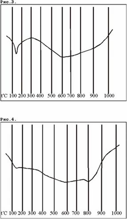 И наконец четвёртый заключительный этап при t° 900 - 1000°С должно быть выделение второй порции воды, связанной с гидроксилами, и образование гематита этот процесс отсутствует в обеих случиях, тоесть глауконит згарает и при згарании не выделяет гематита. Но при (-) t° 800°C, как видно из кривой на рисунке 4, происходит процесс выделения карбонатов, а на кривой рисунка 3 этот процесс не наблюдается.