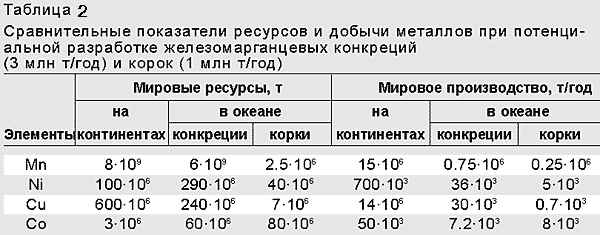 Идея освоения рудных ресурсов океана возникла на базе значительных достижений в области исследований океанского дна, проводившихся ведущими мировыми державами в эпоху холодной войны и активной конкуренции за приоритет в освоении океана как стратегического пространства. Естественно, что эта идея получила поддержку руководства каждой из конкурирующих сторон, поскольку руды марганца и кобальта рассматривались как стратегическое сырье. В океане были проведены сотни специализированных рейсов научно-исследовательских судов США, СССР, а также Индии, Японии, европейских стран, Австралии, Новой Зеландии и ЮАР. Было получено и обработано невиданное ранее количество новой информации о рудном потенциале океана (табл.2), на что было истрачено, по ориентировочной оценке, около 4 млрд долл.