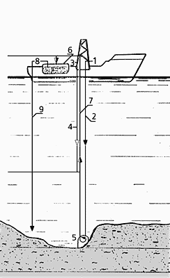 Принципиальная схема разработки конкреционных океанских месторождений методом гидроподъема на специально оборудованном судне. 1, 2 - водяной насос и трубопровод для подачи воды к рабочей головке; 3, 4 - компрессор и трубопровод для подачи сжатого воздуха в пульпу; 5 - рабочая головка с гидромонитором для размыва грунта и всасывающим устройством; 6, 7 - насос и трубопровод для подъема пульпы с конкрециями; 8, 9 - насос и трубопровод для откачки отработанной пульпы и укладки на дно. Система разработана в Московской горной академии. |