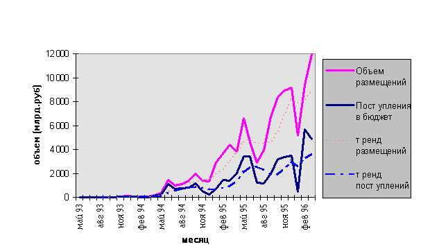 С учетом того, что рынок ГКО получил макроэкономическое значение, Центробанк в виде краткосрочных облигаций получил еще один инструмент для реализации своей регулирующей роли, направленной на управление денежной и кредитной массой. К середине 1995 г. операции Центробанка на рынке облигаций стали приобретать важное регулирующее значение, равное интервенциям на валютном рынке и кредитным аукционам ЦБ РФ.