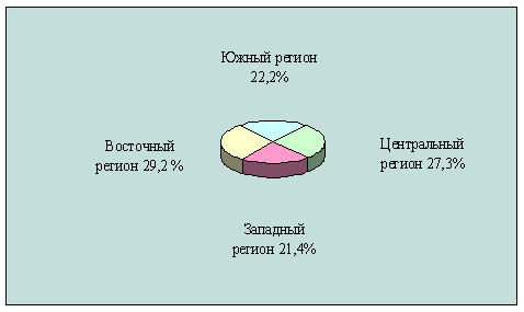 Рис. 3 -- Доля торговых точек в Центральном, Южном, Восточном и Западном регионах в общем количестве торговых точек лекарственными средствами в Украине.