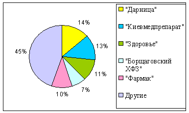 В группе ведущих отечественных производителей лекарственных средств (ежемесячный выпуск свыше 5,4 млн. грн.~1 млн. долл. США) находятся ЗАО ФФ "Дарница", ООО "Киевмедпрепарат", ООО ФК "Здоровье", ЗАО НПЦ "Борщаговский ХФЗ", ОАО "Фармак" (рис. 4)[6; с.23]. Каждый из этих гигантов фарминдустрии занимает около 10% рынка отечественных лекарственных средств. Далее следует группа из более чем трёх десятков предприятий, продукция каждого из них занимает от 1% до нескольких процентов рынка. Среди них — акционерные общества "Индар", "Галичфарм", "Киевский витаминный завод", "Стиролбиофарм" и другие. В третью группу входит более сотни предприятий, выпускающих лишь по 1—2 лекарственных средства, наиболее простых в производстве и дешевых: йод, зеленка, перекись водорода.