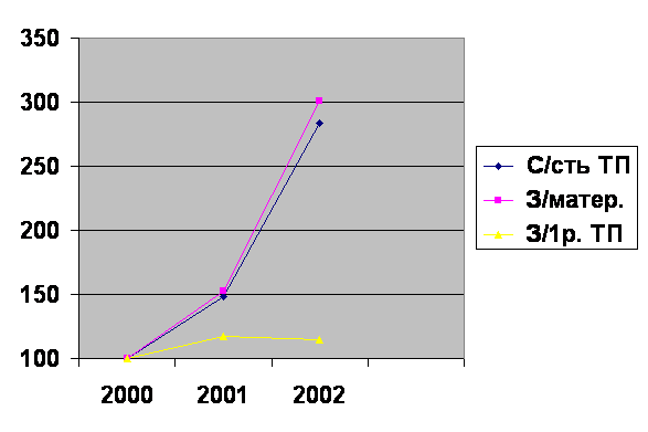 На рис. 5 представлена динамика указанных показателей, а также затрат на 1 рубль товарной продукции за 2000-2002 г.г. Так за этот период себестоимость товарной продукции выросла с 48584 тыс. руб. до 138431 тыс. руб.; материальные затраты увеличились с 33415 тыс. руб. до 100603 тыс. руб.