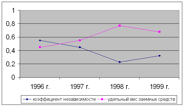 Рис. 2.3. Динамика коэффициента независимости и удельного веса заемных средств ЗАО "Гидронеруд" за 1996 – 1998 гг.