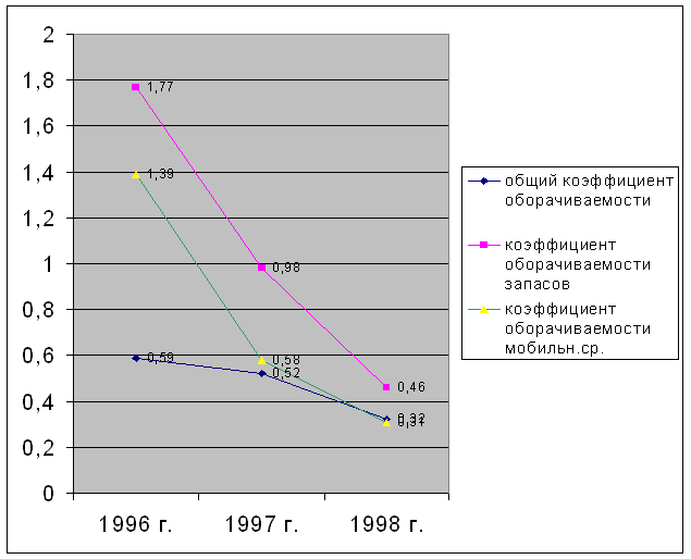Коэффициент оборачиваемости мобильный средств, отражающий скорость их оборота, уменьшился за 1996 – 1998 г. с 1,77 до 0,46, т. е. на 1,31. Это отрицательно характеризует деятельность предприятия и означает, что на каждый рубль мобильных средств ЗАО "Гидронеруд" реализовано продукции в 1996 году на 1,77 рубля, в 1997 году – на 0,98 руб. и в 1998 году – на 0,46 рубля. Динамика данного коэффициента за 1996 – 1998 гг. отражена на рис. 2.