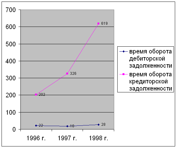 Средний срок оборота дебиторской задолженности характеризует срок ее погашению. За 1996 год значение данного коэффициента составило 22 дня, за 1997 – 18 дней и за 1998 год – 28 дней.