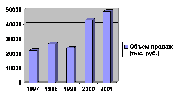 В 2000 году объем продаж увеличился по сравнению с 1999 годом в 2,1 раза. Динамику объемов продаж за пять лет можно проследить по диаграмме (см. на следующей странице).