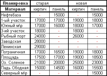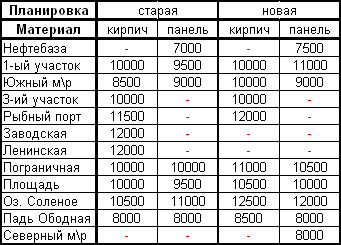 Примечание: все цены, указанные в данных таблицах не я являются точными для определенного района, т.к. цена на квартиры складывается не только из факторов расположения района города, планировки, и строительного материала (кирпич\панель), но и других факторов. Так например цена на квартиру увеличивается если в квартире имеется телефон, балкон, горячая вода и уменьшается если квартира расположена на 1-ом или 5-ом этажах и др. факторов.