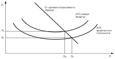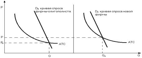 Фирмы-олигополисты, зная, что появление нового конкурента уменьшит их долю рынка, попробуют не допустить этого, воспользовавшись своими преимуществами. Они установят цену ниже Рн , но в силу экономии от масштабов производства и в этом случае (между Рн и Ро) будут получать прибыль. Новая же фирма понесет значительные потери и вынуждена будет уйти с рынка (при ценах ниже Рн кривая спроса Dн лежит ниже АТС, и, следовательно, новая фирма не может покрыть своих издержек).