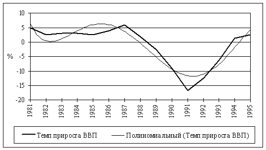На рис.1-1 изображена динамика изменений темпов роста ВВП за период 1981-1995г. Наряду с этим изменения темпов аппроксимированы с помощью полинома пятой степени, дабы проиллюстрировать характер перемен и колебания фактических значений вокруг этого тренда.