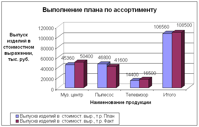 Из диаграммы видно, что пылесосов выпущено меньше, а муз. центров и телевизоров больше, чем запланировано.