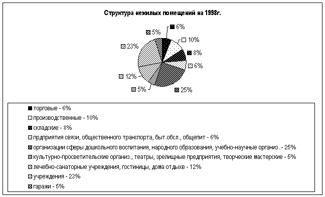 На территории Москвы в 1998 г. насчитывалось более 37 тысяч нежилых строений, общей площадью 66, 9 млн. кв. м. встроенных в жилой фонд нежилых помещений. Из них 30,4 млн. кв. м. (37,5 %) находилось в федеральной собственности, 42,2 млн. кв. м. (52,1 %) - в собственности Москвы, 8,4 млн. кв. м. (10,4 %) - в других формах собственности. Общая площадь нежилых помещений в Москве превышала 80 миллионов квадратных метров, что при средней цене хотя бы в 1 тыс. долларов за кв. м. составляло 80 миллиардов долларов. Структура нежилых площадей показана ниже на диаграмме № 1: