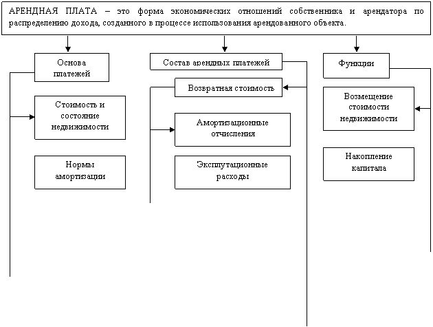 Арендная плата – это форма экономических отношений равноправных партнеров (собственника и арендатора) по распределению вновь созданной стоимости в процессе использования арендованного имущества. Она выполняет функции возмещения стоимости объекта недвижимости, накопления, стимулирования трудовой активности, перераспределения доходов и выступает одной из экономических форм реализации права собственности (см.схему № 9).