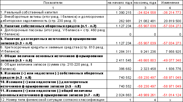 Аналогичные выводы можно сделать, анализируя разницу реального собственного капитала и уставного капитала (см. п.2.2), которая является основным исходным показателем устойчивости финансового состояния организации. Отсюда следует, что даже минимальное условие финансовой устойчивости предприятия не выполняется.