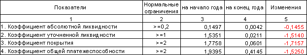 На конец отчетного периода все коэффициенты ликвидности и платежеспособности имеют значения значительно ниже допустимых, что однозначно свидетельствует о глубоком кризисном состоянии предприятия и является основанием для признания его неплатежеспособным.