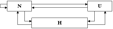 На рынке труда между различными его подструктурами в больших масштабах и достаточно динамично происходит непрерывная циркуляция крупных, средних и мелких контингентов людских ресурсов. Значительное число работников постоянно входит в состав экономически активного населения, выбывает из него, трудоустраивается и через некоторое время вновь увольняется, затем включается в поиск следующей работы и т.д. Следовательно, на рынке труда формируются определенные потоки: выбывающие из состава рабочей силы; вступающие в состав рабочей силы; отказавшиеся от поисков работы; потерявшие работу; получившие работу. Представим движение происходящее в контингенте трудоспособного населения (рис.2). В каждый момент все трудоспособное население оказывается разделенным на три группы: а) работающие (занятые – N); б) неработающие, но активно ищущие работу (безработные – U); в) не работающие и не ищущие ее (Н). Часть людей меняет место работы, практически не прерывая своей трудовой деятельности (1). Другие оставляют свое место работы, желая трудоустроиться в другом месте, но не имея возможности осуществить это мгновенно (2). Часть трудоспособных людей не желает больше трудиться и переходит в группу неработающих, не являющихся однако безработными (6). В то же время у части добровольно неработающих появляется желание устроиться на работу и это желание может осуществиться сразу (7) или на поиск работы может потребоваться время (5). В свою очередь, часть безработных в данный момент поступает на работу (3), а другая часть по каким-то причинам прекращает активно искать работу и тем самым переходит в группу добровольно неработающих (4).