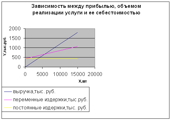По графику можно определить, при каком объеме реализации фирма получает прибыль, а при каком ее не будет. Можно определить также точку, в которой затраты будут равны выручке от реализации услуг, т. е. точку безубыточного объема реализации продукции (услуг). В нашем примере точка расположена приблизительно на уровне 35% возможного объема реализации услуг.