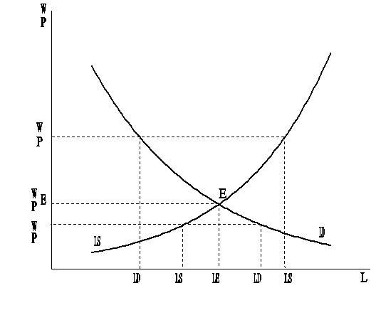) предложение на рынке труда (O-LS’) превышает спрос (O-LD’) на величину LD’-LS. В этой ситуации происходит отклонение от положения полной занятости, рабочих мест не хватает для всех желающих продать свой труд при заработной плате