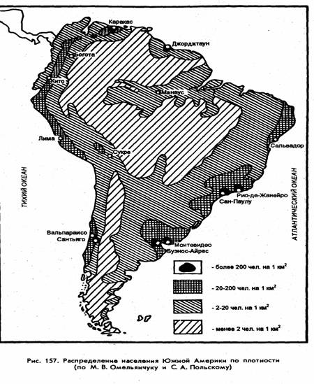 Рисунок наглядно показывает, что в Южной Америке в целом наименее заселены внутренние районы — огромные пространства тропических лесов Амазонии, часть которых вообще безлюдна, и некоторые горные области Анд. Это свидетельствует о слабой освоенности значительной части территории континента. Что же касается более густо заселенных территорий, то Я. Г. Машбиц в своей известной монографии о Латинской Америке подразделил их в соответствии с двумя различными типами размещения населения (и шире — производительных сил): внутренним и приокеаническим.