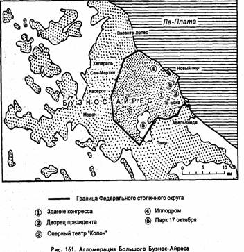 Агломерация Большого Буэнос-Айреса начала формироваться еще в ХIХ веке, когда стали разрастаться пригороды. В настоящее время она состоит из двух главных частей — Федерального столичного округа и 19 пригородов (см. рис. 161). Соотношение между ними все время изменяется в пользу пригородов, на которые приходится уже более всего населения агломерации. Это свидетельствует о больших масштабах урбанизации.