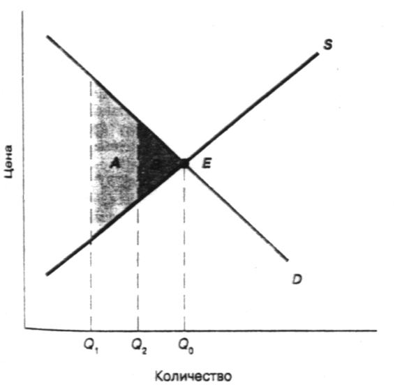 На рис. 4 общественная полезность в результате увеличения выпуска с Q1 до Q2 измеряется затененной площадью, обозначенной A. Из рисунка ясно, что в данной ситуации имеет место чистый прирост полезности. При объеме выпуска Q1 предельная ценность для потребителей превышает предельные издержки, так что увеличение выпуска до Q2 повышает благосостояние на величину всей площади, обозначенной A. Таким образом, выпуск следует увеличить до Q2. Но при Q2 предельная ценность все еще превышает величину предельных издержек, так что выпуск следует наращивать и дальше. Фактически он должен все время увеличиваться до точки Q0, так как увеличение с Q2 до Q0 повысит совокупный излишек на величину, равную площади B. Если выпуск увеличивается за пределы Q0, то совокупный излишек падает, потому что потребители оценивают дополнительный выпуск ниже предельных издержек его производства. Таким образом, в точке Q0 сумма излишка для потребителей и для производителей максимизируется.
